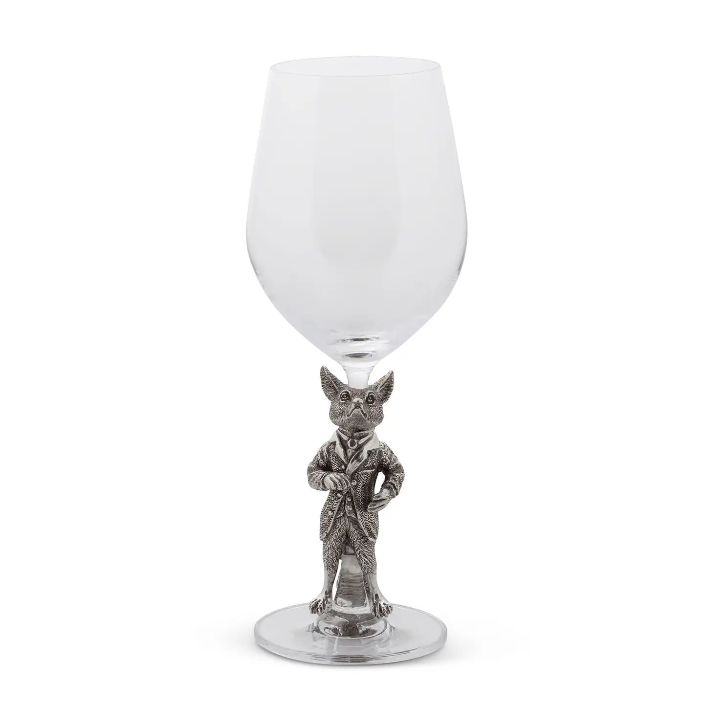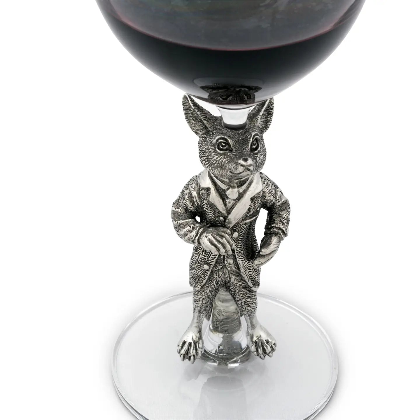 Brimming with character, this stemmed glass rests atop a finely detailed pewter fox, impeccably dressed in traditional hunting attire. The whimsical yet refined design blends country sporting heritage with elegant tableware, making it as much a conversation piece. Perfect for gifting or for adding a touch of playful sophistication to your own collection.